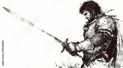 Heroic Fantasy Knight in Ornate Armor Holding Glowing Sword on White Background