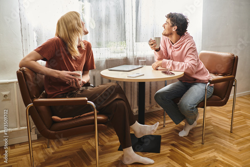 Two loving men sit together in a sunny room, sharing smiles and coffee at a small table.