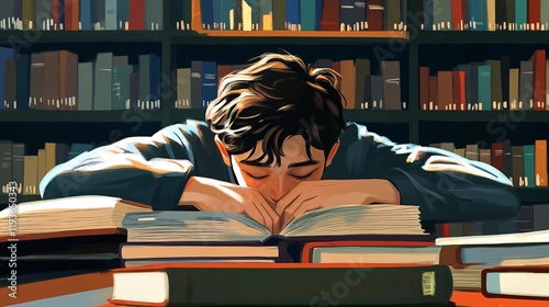 A young Hispanic male student rests his head on an open book, surrounded by stacks of books in a cozy library setting.