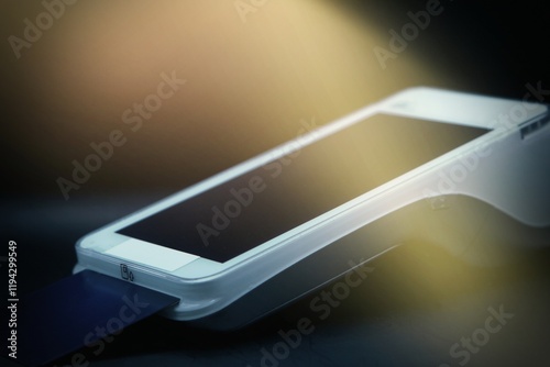 Modern credit card terminal with a credit card inside , isolated with a flare.