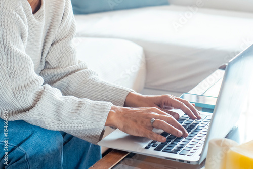A mature woman working from home, sitting on a couch with a laptop, browsing social media, managing her online business, chatting, and enjoying her time in a casual and productive home office setup