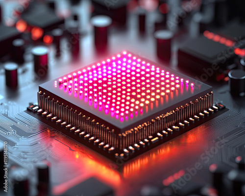 A close-up of a vibrant microchip illuminated with colorful lights, showcasing intricate circuitry on a dark background.