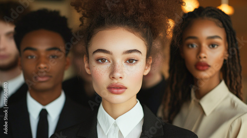 Grupa młodych ludzi pozuje do zdjęcia w biurze, generative ai