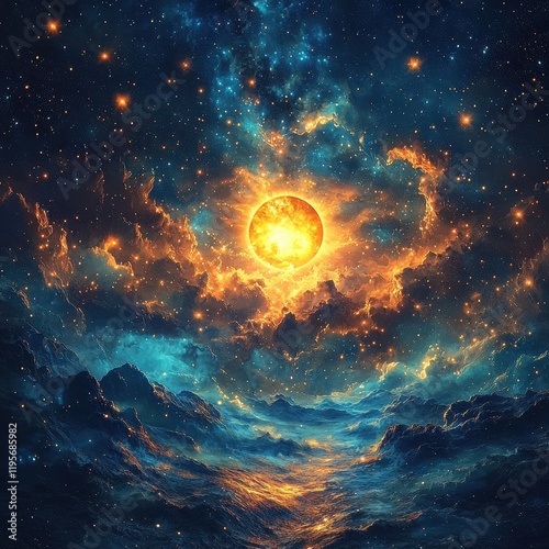 Celestial Sunrise Over Cosmic Ocean with Starry Sky