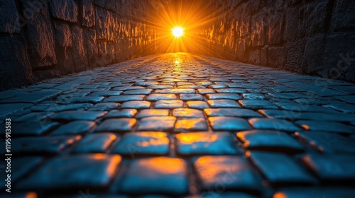 Cobblestone alley sunset hope, city background