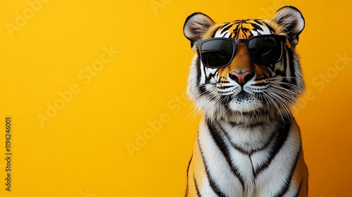 A cool tiger wearing sleek black sunglasses, standing confidently against a bright yellow background with intricate details in its fur