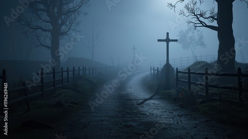 Eerie foggy path with a cross and trees in a dark atmosphere.