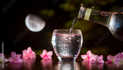 春・桜の花びらが舞い散る月明りの中 グラスに日本酒を注ぐ 花見・アルコール・酒・夜桜・宴会・日本・季節のイメージ背景