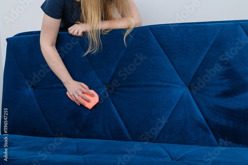 Niebieska sofa podczas czyszczenia, czyścić poplamiony materiał pokrywajacy łóżko