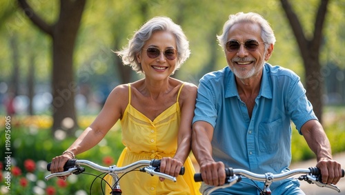 Cheerful active senior couple with bicycle in public park together having fun lifestyle. Perfect activities for elderly people. Happy mature couple riding bikes, bicycles in park