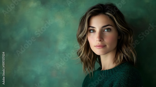 kobieta, europejka, brązowe włosy, średniej długości włosy, zielony sweter, zielone tło, minimalistyczny styl, profesjonalny wygląd, portret, monochromatyczny look, elegancja, subtelny styl, reklama,