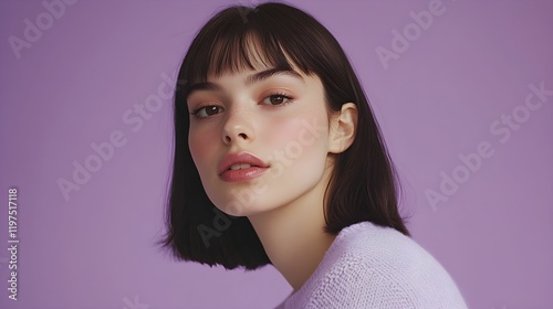 kobieta, europejka, brązowe włosy, lawendowy fiolet, fioletowy sweter, fioletowe tło, minimalistyczny styl, delikatne światło, profesjonalny wygląd, portret, monochromatyczny design, elegancja, przest