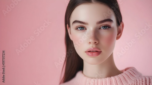 kobieta, brązowe włosy, falowane włosy, pastelowy róż, różowe tło, różowy sweter, łagodny wyraz twarzy, spokojna mimika, minimalistyczny styl, ciepło, harmonia, jasne tło, młoda kobieta, naturalność,