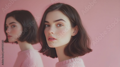 kobieta, brązowe włosy, falowane włosy, pastelowy róż, różowe tło, różowy sweter, łagodny wyraz twarzy, spokojna mimika, minimalistyczny styl, ciepło, harmonia, jasne tło, młoda kobieta, naturalność,