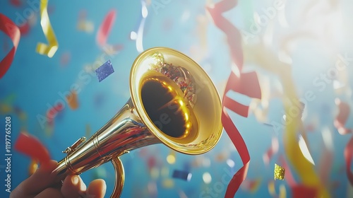 A golden trumpet held up against a vibrant blue background with colorful confetti flying around. The scene is celebratory and joyful, suggesting a festive occasion.
