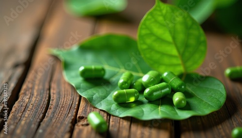 Moringa leaf & capsule display on wood Healthy supplement , medicine, health, herbal