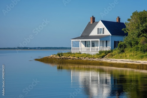 A serene waterfront cape cod house with a porch, reflecting in calm waters under a clear blue sky. Lush greenery surrounds the property, creating a peaceful atmosphere.