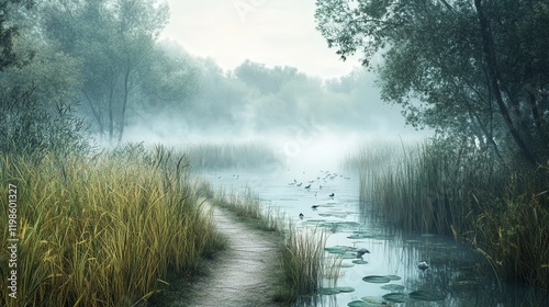foggy marsh with a narrow footpath winding through tall reeds, leading