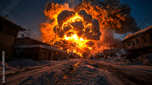 Explosion in verschneiter Stadt mit Feuerwolke