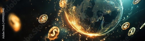 A dark matte background showcases a digital globe surrounded by floating gold currency symbols including dollar, euro, and yen, highlighting a modern approach to wealth management