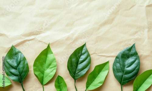 A top-down view of green leaves sprouting from recycled craft paper, symbolizing a minimalistic approach to eco-friendliness, zero waste, plastic-free, and energy-saving lifestyles