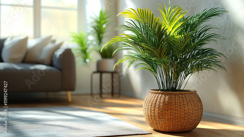 a plant in a wicker on a wooden floor