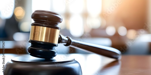 A gavel resting on a wooden block, commonly associated with legal proceedings and courtrooms. Concept Gavel Symbolism, Legal Proceedings, Courtroom Essentials, Justice System Tools