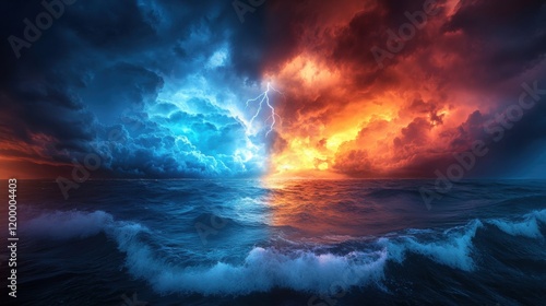 Dramatic Sky and Ocean Scene with Lightning and Colorful Clouds