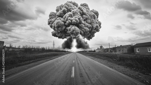 A dramatic black and white image of a large explosion on a deserted road conveys danger and apocalyptic themes