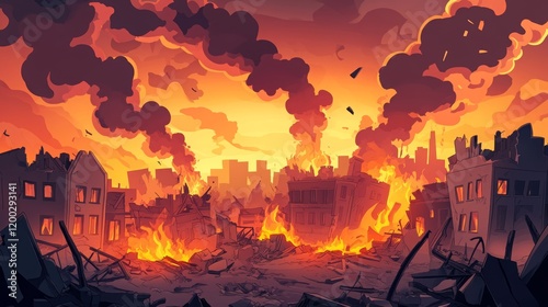 Cartoon of a city ablaze with smoke, flames, and broken buildings in a post-apocalyptic theme.