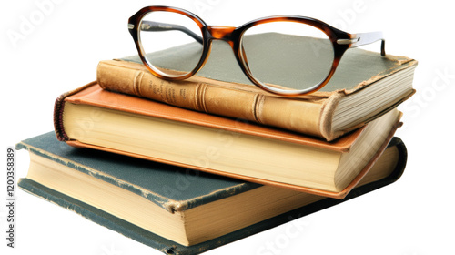 Stacked books with glasses on top in a light setting showing a study space isolated on transparent background