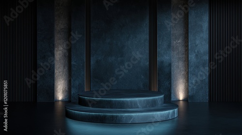 Dark room with a circular platform in the center. the platform is made of a dark material and has a smooth surface.