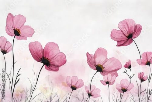 A minimalist watercolor painting of pink meadow flowers with defined black outlines and subtle shading.