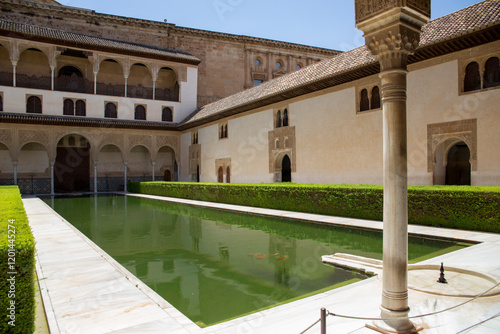 View of the Court of the Myrtles, with a large pool, located in the Comares Palace inside the Alhambra. It is one of the main monuments of Granada, Spain.