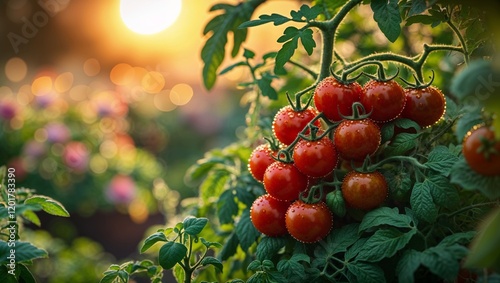 Fresh red tomatoes ripening on the vine during golden hour in a garden