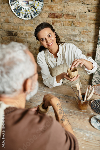Mature couple enjoys quality time shaping clay in a rustic pottery studio filled with creativity.