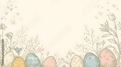 Wielkanoc, flat lay, pastelowe kolory, jajka, zajączki, ceramiczne, kwiatowe płatki, dekoracja, wiosna, delikatne kolory, strefa tekstu, branding, subtelność, minimalistyczne, elegancka aranżacja, wio