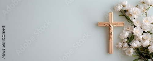Christian background with golden crucifix on neutral light blue wall background decorated with branches of white flowers.