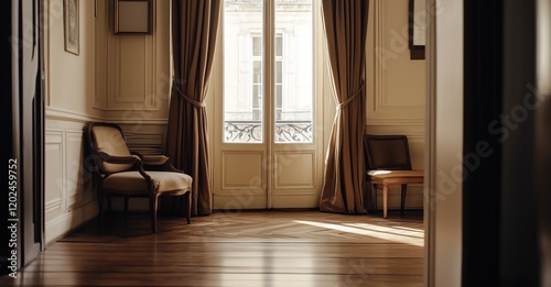 Une pièce avec mur clair avec un plancher en bois, une porte et des rideaux marrons en arrière-plan, un intérieur classique dans le style du design français, simple et élégante.