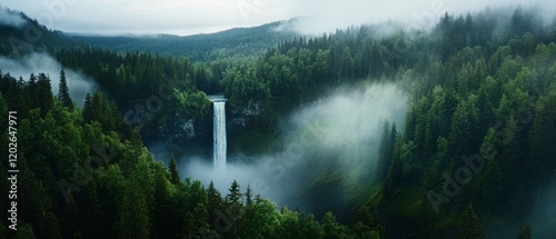 A majestic waterfall cascades through a lush, misty forest, enveloped by rolling hills and a serene, cloud-filled sky, creating a tranquil, ethereal scene.