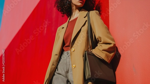 28. A woman wearing a 1980s-inspired oversized blazer with a contemporary handbag