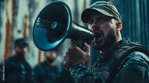 A SWAT negotiator interacting with a suspect through a megaphone.