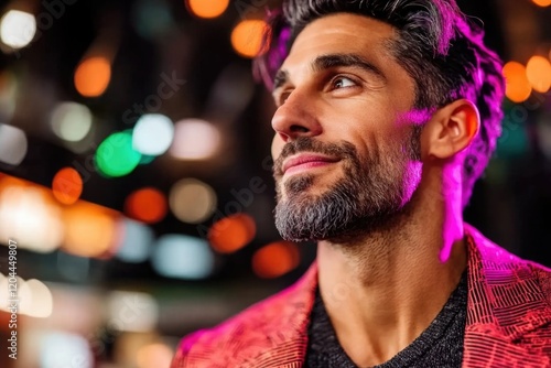 Confident caucasian young male amidst colorful night lights