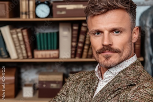 Confident caucasian adult male in tweed jacket with bookshelf background