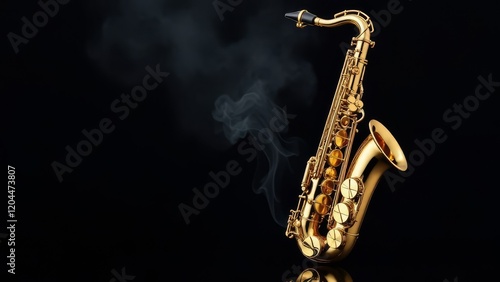 Golden shiny alto saxophone on black background with smoke. copy space