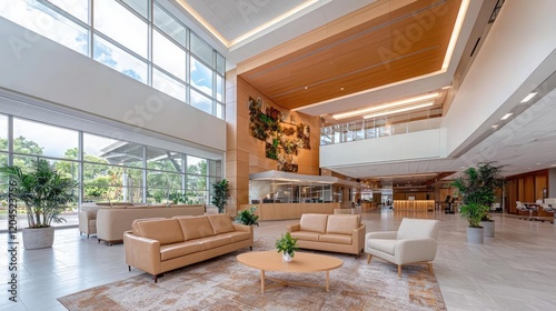 Modern hospital lobby with seating, artwork, and natural light
