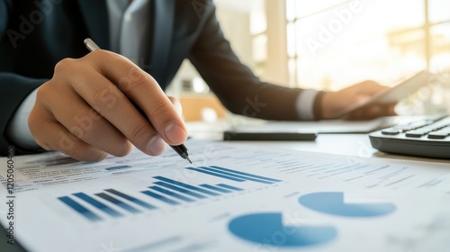 Businessman giving a presentation in a meeting room, using a projector to explain key business data and financial reports.