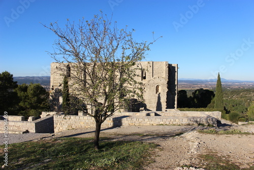 Abbaye Saint-Félix-de-Montceau à Gigean (Hérault) : vue d'ensemble derrière un amandier