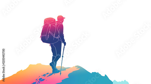 Solo traveler in flat style with a large backpack hiking up a mountain trail, using a bright color palette and simple lines on a white background