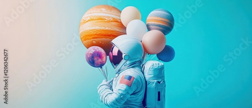 Astronaut in spacesuit holding planet balloons, concept of space exploration, fantasy and imagination